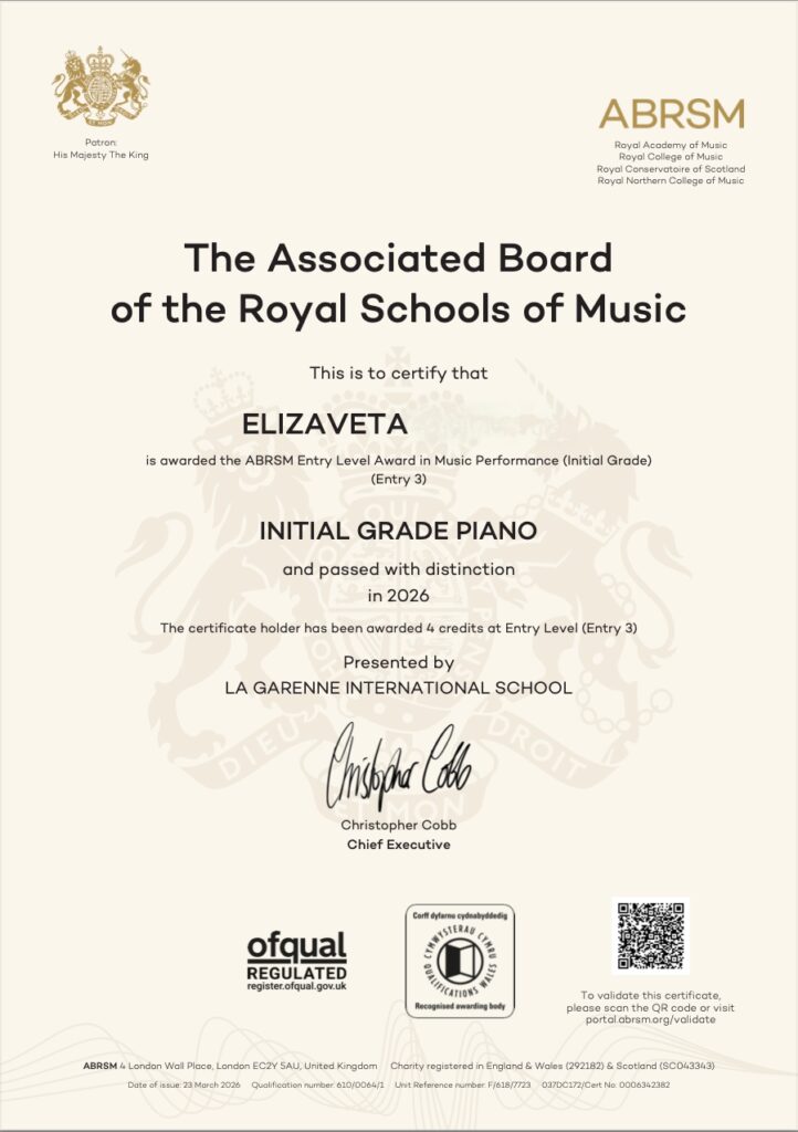 Liza has passed her first ABRSM piano exam in Initial Grade Piano with Distinction, a fantastic result and an outstanding first achievement in her musical journey.